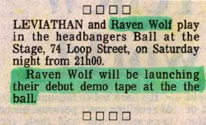 Radio Announcement: Radio 5, Tuesday at 7:52pm, the following announcement was made: "Raven Wolf will be launching their demo at The Stage this Saturday. Tapes will be available there. That's Raven Wolf, Leviathan and Slay Ride live at The Stage..." |