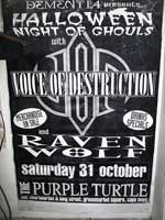 DATE: 31 October 1998 (Saturday) VENUE: The Purple Turtle BANDS:Raven Wolf, V.O.D. ENTRANCE FEE: UNKNOWN TIME: UNKNOWN |